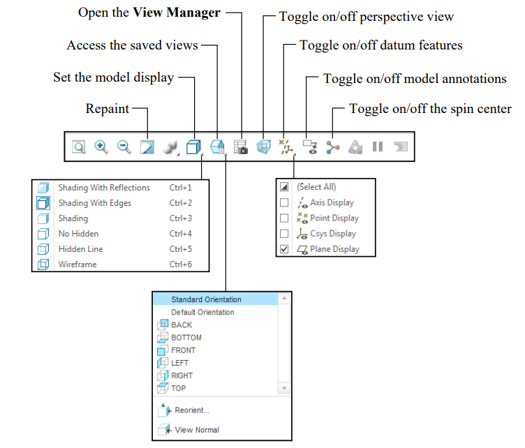 3D 모델링 및 디자인 작업을 수행하는 동안 그래픽 표현과 상호 작용을 제어하기 위한 도구 모음입니다. Graphics toolbar에는 다양한 그래픽 관련 기능이 있으며, 모델을 시각적으로 조작하고 표현하는 데 사용됩니다.