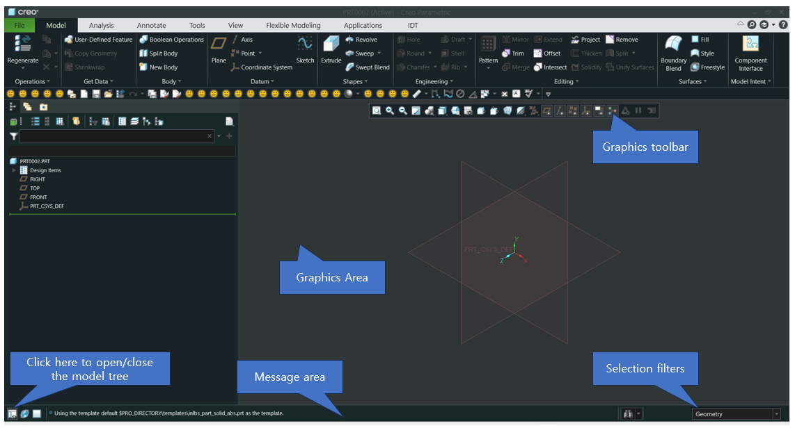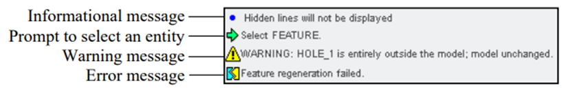 Creo Parametric에서 "Message Area"는 사용자에게 시스템 메시지, 경고, 오류 및 정보 메시지를 표시하는 영역입니다. 이 영역은 Creo Parametric 소프트웨어와 상호 작용하면서 발생하는 다양한 메시지 및 알림을 사용자에게 제공합니다. Message Area의 주요 기능은 다음과 같습니다: