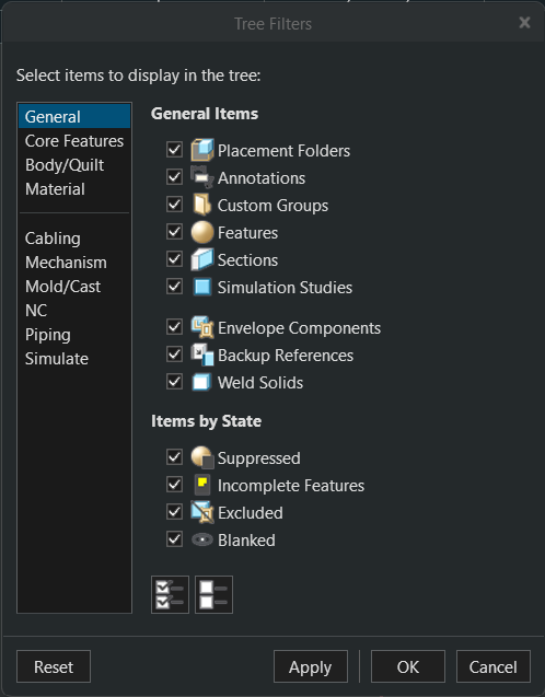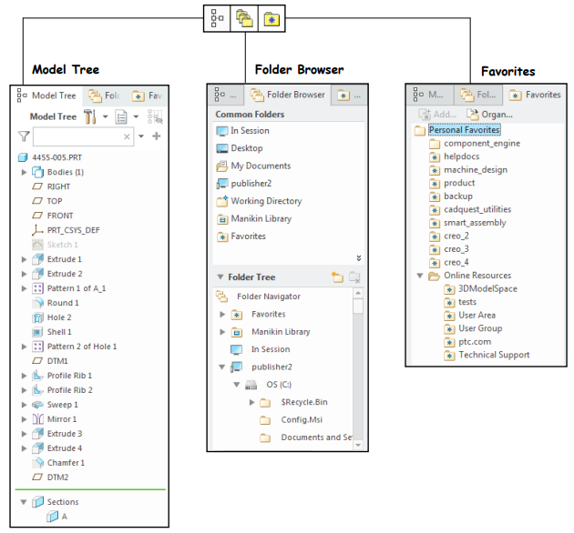 기본적으로 모델 트리는 도킹되어 있습니다. 도킹된 모델 트리의 위치는 Creo Parametric 옵션 대화상자의 Windows 설정 범주를 사용하여 변경할 수 있습니다. 아래 나열된 구성 옵션을 사용하여 모델 트리를 도킹 해제할 수 있습니다(별도의 창으로 표시). Config.pro 파일 옵션 - enable_tree_indep yes