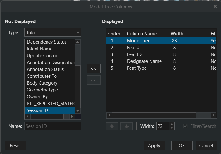 모델 트리에 표시되는 열(칼럼)을 사용자가 선택하여 커스터마이징할 수 있는 기능을 나타냅니다. 이 기능은 사용자가 모델 트리에 표시되는 정보를 조절하여 작업 흐름에 맞게 필요한 정보를 더욱 간편하게 확인할 수 있게 해줍니다.